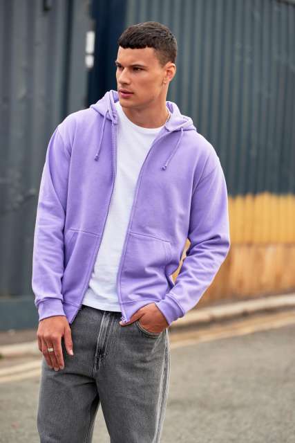 80-% bombaž z vijačnim predenjem/20-% poliester Standardni kroj Majica s kapuco na zadrgo po celotni dolžini Zadrga YKK s prekrivno tkanino v enaki barvi Kapuca iz dvojne tkanine Okrogle vrvice Kengurujska žepa Brušen notranji flis Rebraste manšete in rob Detajl z dvojnim šivom Etiketa, ki se lahko odtrga 100-% bombažna tkanina